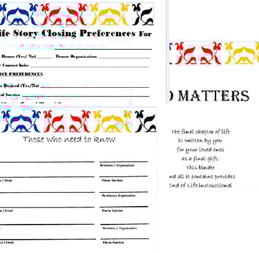 This section, also provides your final gift to your loved ones. It provides your family & friends with the essential needs and processes related to end of life. This act takes a huge burden off your loved ones and serves to support your wishes when your story has come to a close.